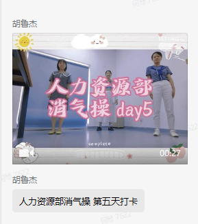 挑战过程中,各个部门(组)/圈层精心录制了各项团体运动的打卡视频,激昂的音乐、欢快的节奏,活力满满,感染力十足。