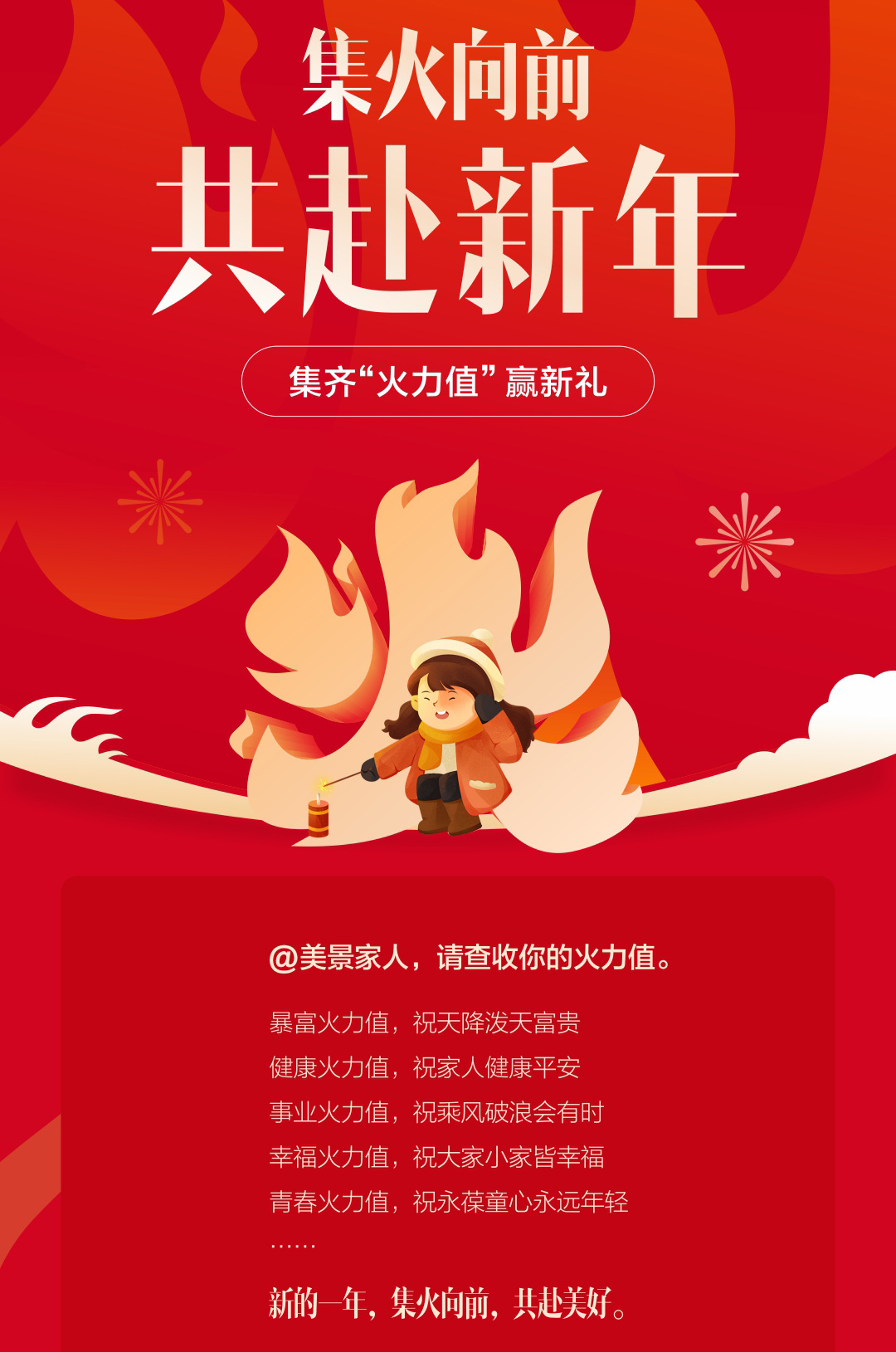 「快乐的大家小家」是美景新春团拜会不变的主题,让家链接家,让幸福链接幸福。盛会前期,我们开展了线上趣味抽奖活动——「集火迎新礼」,点燃了新春的第一把火。